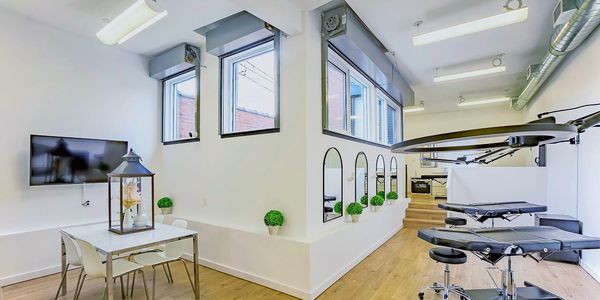 The studio is approximately 1000 sq ft including 4 beds, 4 rolling stools, 4 wall-mount lights, a table that seats 4-6 people (with 4 chairs), TV to display a presentation, a small kitchenette, bathroom, waiting area, one parking spot, and a private terrace with a table. Additional chairs or tables can be arranged.