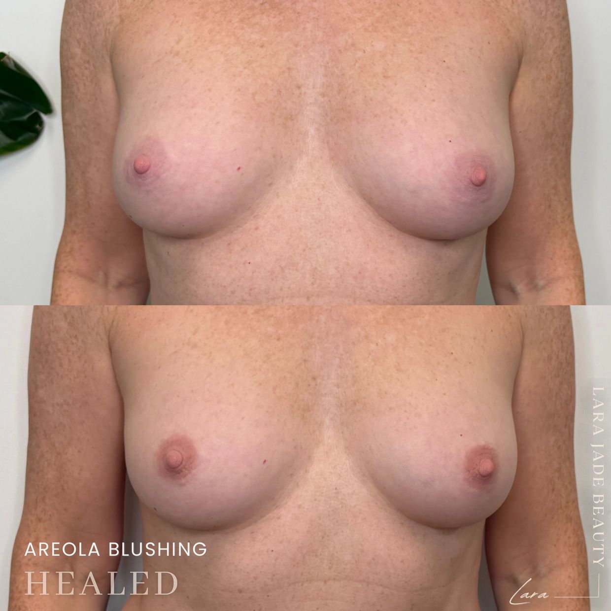 Areola blushing before, right after and healed result after one session with Lara Jade Beauty